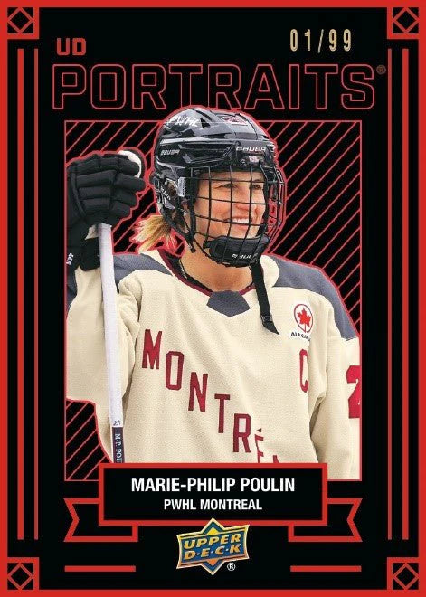 The UD Portraits debut in PWHL with the classic up-close imagery that collectors have become familiar with! This 20-card set also features a Gold (#’d to 299) and Red parallel (#’d to 99)