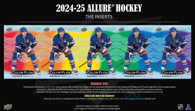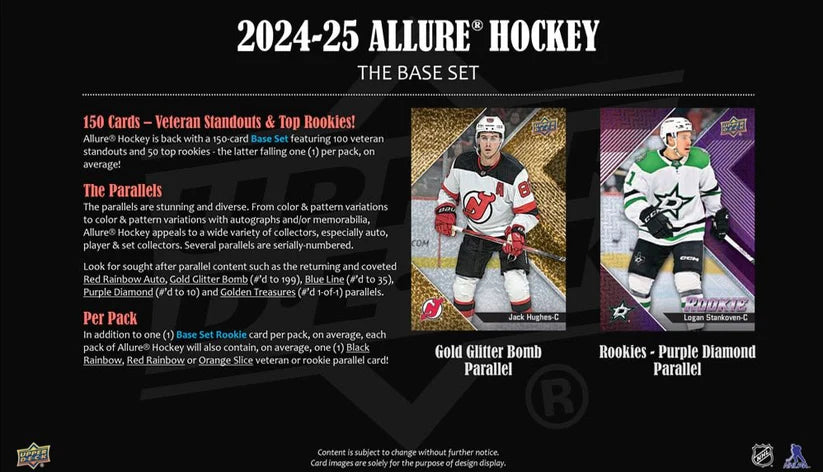 THE BASE SET: Allure® Hockey returns with a 150-card Base Set consisting of 100 veteran standouts and 50 rookies – the latter falling one (1) per pack, on average. From the popular Black Rainbow, Red Rainbow, Red Rainbow Auto and Orange Slice parallels to the coveted 1-of-1 Golden Treasures and Golden Treasures Auto parallels, the Base Set lineup is deep and full of chase cards! The product also includes the Base Set Printing Plates.