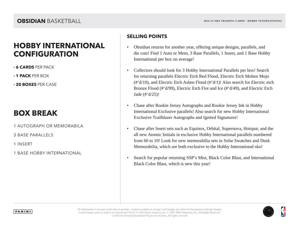 Each 2024-25 Panini Obsidian Basketball International Hobby Box contains 1 Autograph or Memorabilia card 1 Insert, and 1 Base Hobby International per box on average!