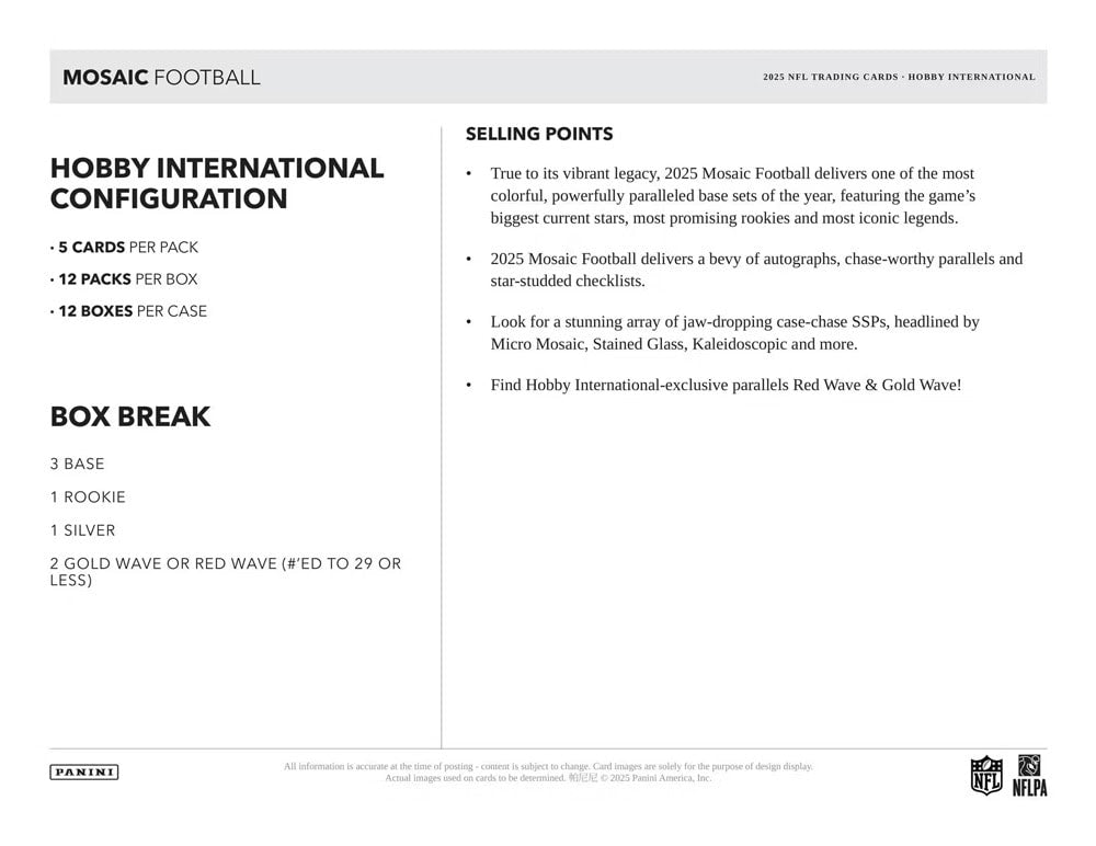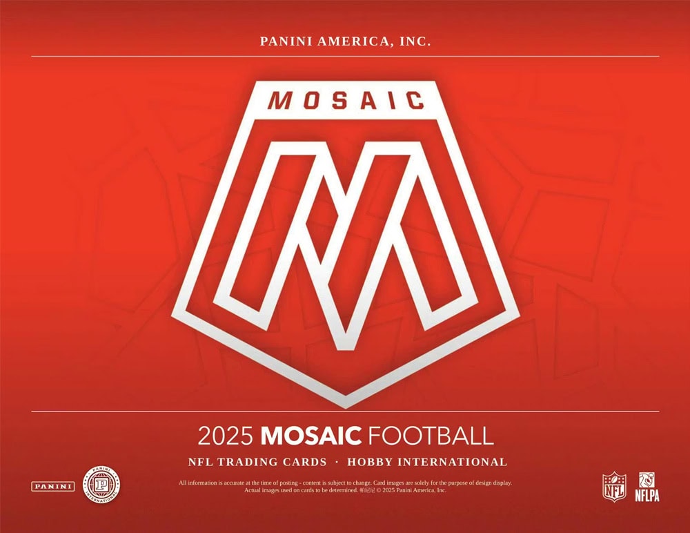 Each 2025 Panini Mosaic Football International Hobby Box contains 1 Rookie, 1 Silver and more per box on average!