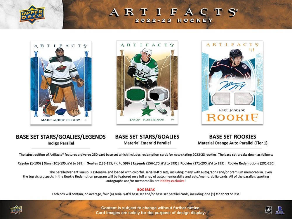 The latest edition of Artifacts features a diverse 250-card base set which includes redemption cards for new-skating 2022-23 rookies. The base set breaks down as follows (subject to change):
