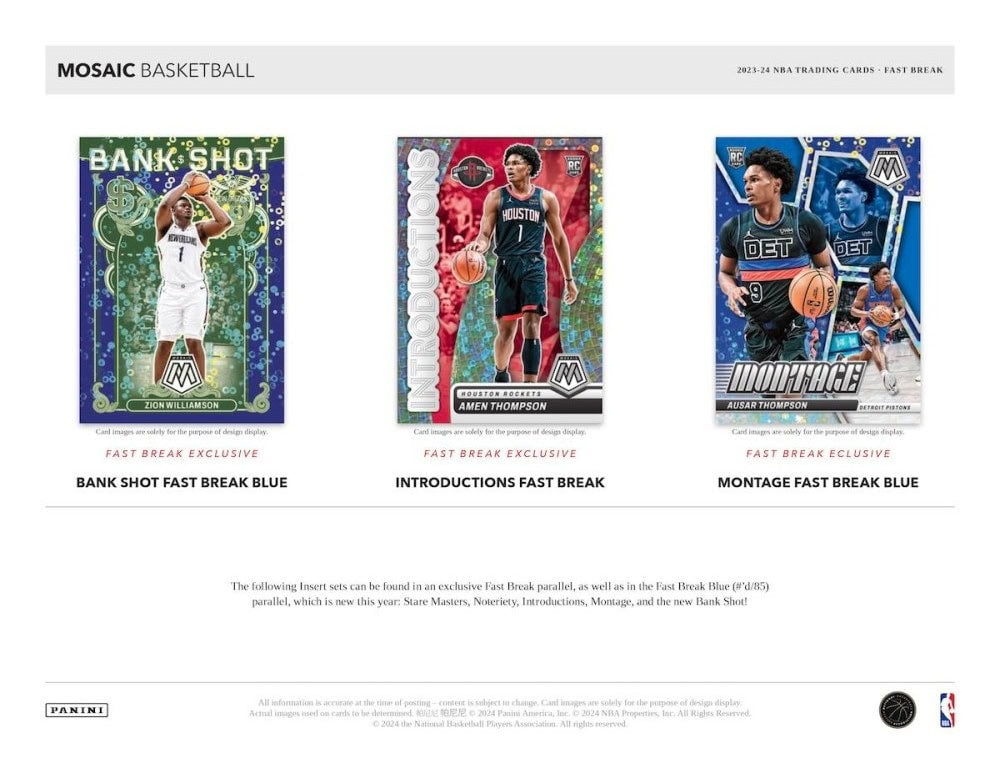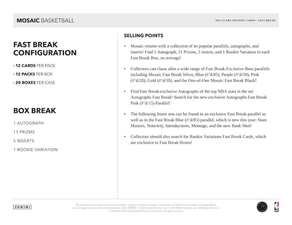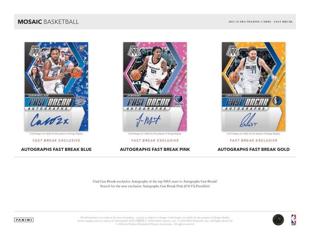 Each 2023-24 Panini Mosaic Basketball Fast Break Box contains 1 Autograph, 11 Prizms, and 5 Inserts per box on average!