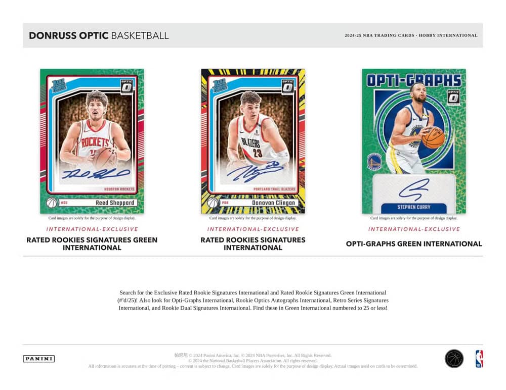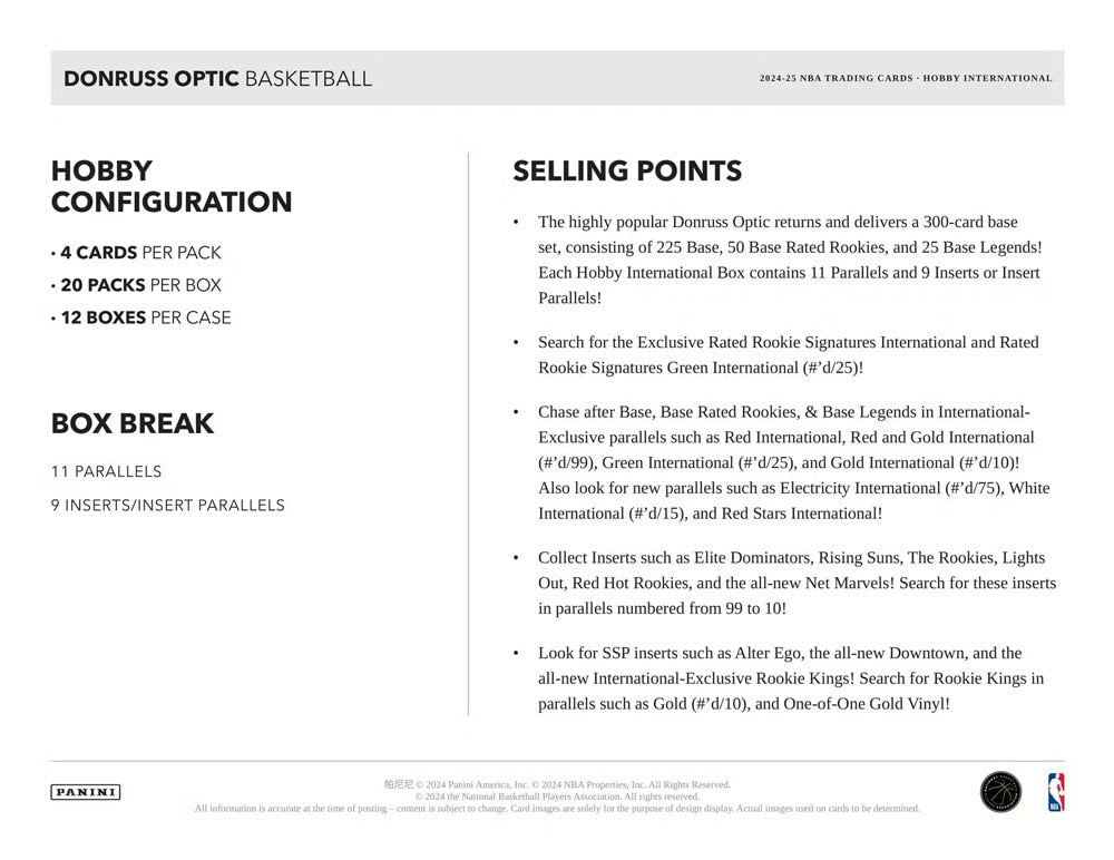 Each 2024-25 Panini Donruss Optic Basketball Hobby International Box contains 11 Parallels and 9 Inserts/Insert Parallels per box on average!
