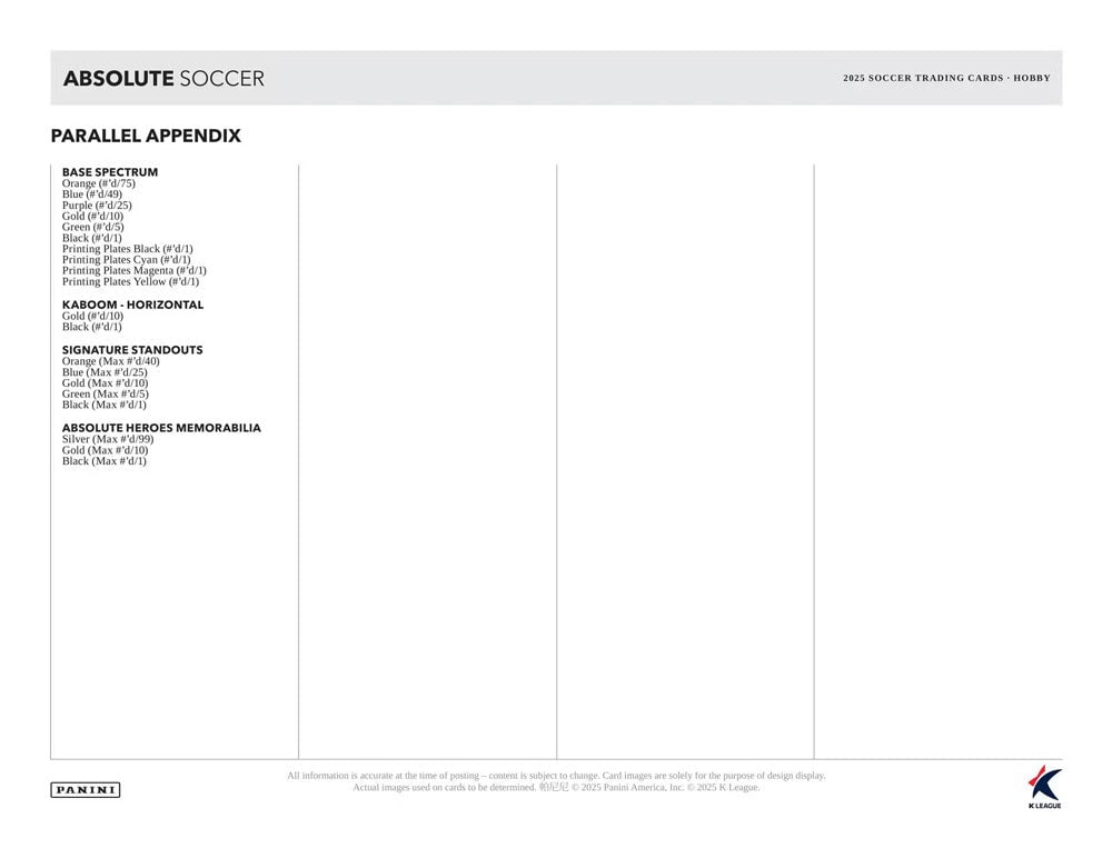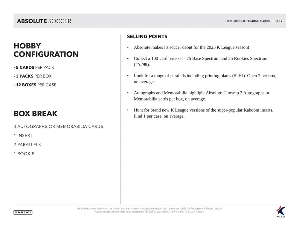 Each 2025 Panini Absolute K League Soccer Hobby Box contains 3 Autograph or Memorabilia Cards and more per box on average!