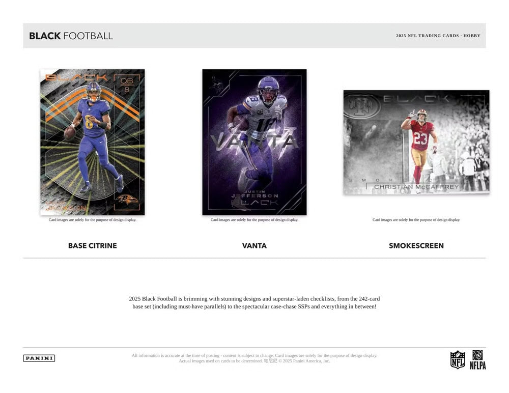 2025 Black Football is brimming with stunning designs and superstar-laden checklists, from the 242-card base set (including must-have parallels) to the spectacular case-chase SSPs and everything in between!