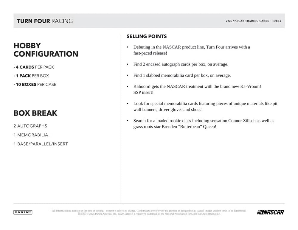 Each 2025 Panini Turn Four Racing Hobby Box contains On Average 2 Autographs, 1 Memorabilia Card & 1 Base, Parallel or Insert, per box on average!