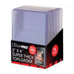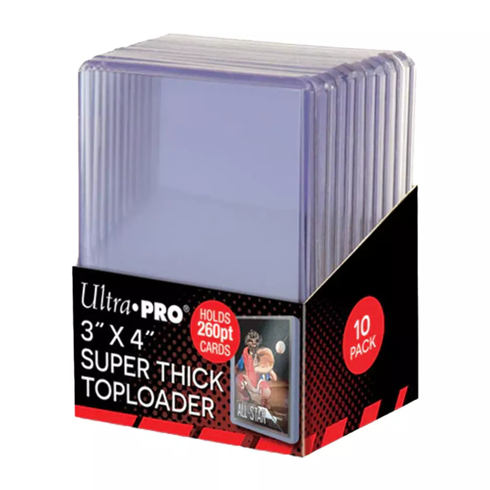 Protect your valuable trading cards with Ultra PRO's super clear, 3" x 4" "Super Thick" Toploaders for standard-sized cards up to 260pt thickness. These rigid PVC plastic holders enclose the cards and keep them clean while preventing damage. Each pack comes with 10 individual pieces.